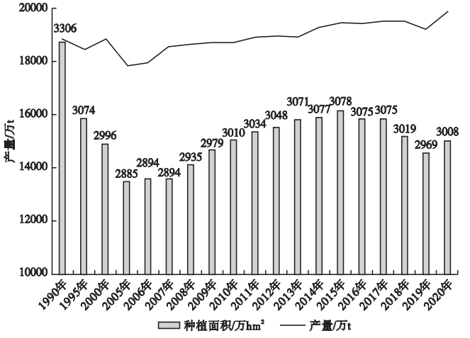 2005年之前,我国水稻的种植面积远大于2005年之后,但是产量却不如近些年高。2005—2020年,在国家政策支持下,我国水稻的种植面积呈逐年大幅上升趋势,水稻总产量也较1990—2005年平稳。2005—2018年我国水稻种植面积保持平稳上升趋势,2019年由于全国气候原因种植面积下降,但是产量却没有受到较大影响,这些现象得益于水稻田除草剂的品种更新、合理使用以及水稻品种的改良。2020年我国水稻种植面积恢复,增长至3,008万hm2,比2019年增加39万hm2,增幅1.3%。其中早稻面积增加30.1万hm2,中晚稻面积增加8.1万hm2。种植面积的扩大,主要得益于国家高度重视以及对水稻田植保科研的大力支持。从产量上可以看出:自2012年以来我国的水稻产量始终保持丰产且产量平稳,2020年比2019年产量有所上升(见图2)。