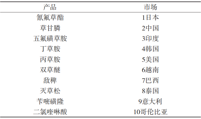 全球水稻田除草剂销售额前3名依次为氰氟草酯、草甘膦、五氟磺草胺。2018年,日本尽管种植面积减少了0.4%,但是由于日元贬值以及产品价格提高,日本水稻田除草剂市场增长了1.4%,达到6.05亿美元。2018年中国的水稻田除草剂市场销售额增长10.0%,达到4.86亿美元。我国水稻杂草主要包括稗草、扁秆藨草、牛毛毡、雨久花等,除草剂产品包括灭草松、丁草胺、草铵膦和草甘膦。目前,我国水稻杂草对常用除草剂的抗性呈上升趋势。印度的除草剂使用量相对较低,2018年水稻田除草剂市场增长了10.4%,达到2.12亿美元。水稻田使用前十的除草剂品种及市场见表1。