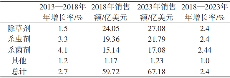 2013—2018年水稻田农药市场销售额年增长率为2.7%,2018年销售额达59.72亿美元,杀菌剂、杀虫剂、除草剂的年增长率分别为4.1%、3.3%、1.5%,销售额分别达到15.14、19.36、24.05亿美元。预测2023年水稻田农药销售额为67.18亿美元,2018—2023年水稻田除草剂年增长率预测为2.4%,销售额将达到27.08亿美元(见表2)。