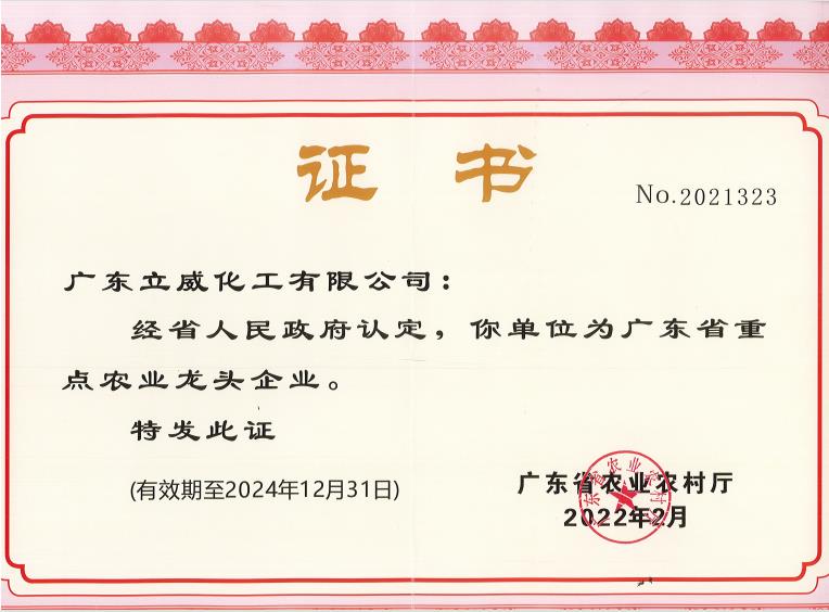 广东立威化工有限公司荣获广东省重点农业龙头企业