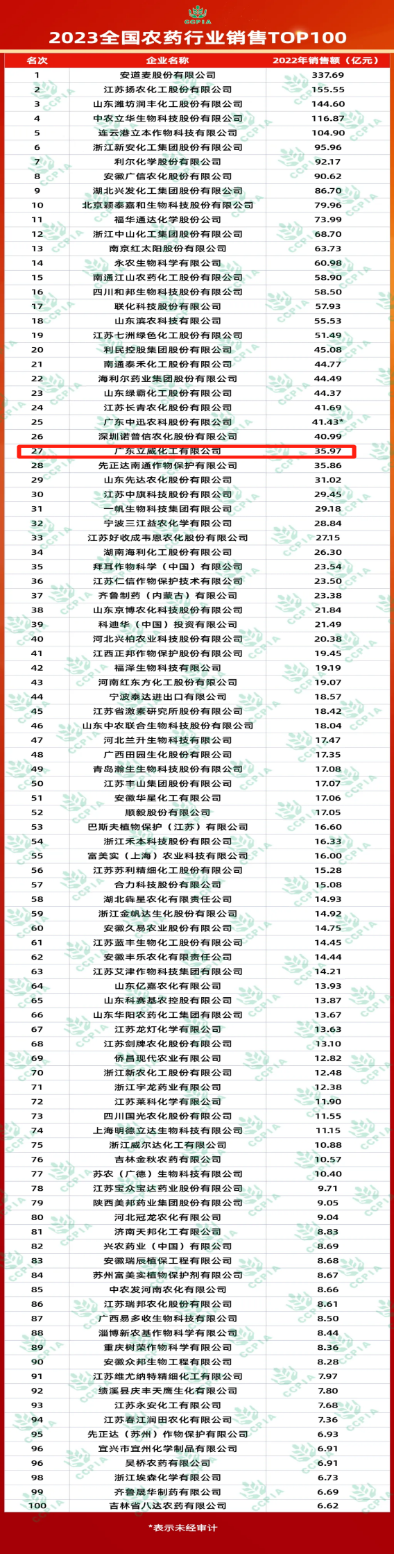 2023年5月16日,中国农药工业协会发布了2023全国农药行业销售TOP100名单。广东立威化工有限公司再创佳绩,以35.97亿元的销售额位居全国排名第27名。